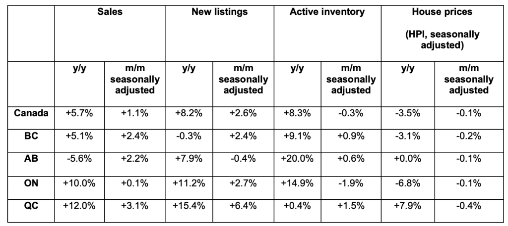 - Alberta: Sales down 5.6% y/y, listings up nearly 8%. Prices are flat, suggesting balance between buyers and sellers.