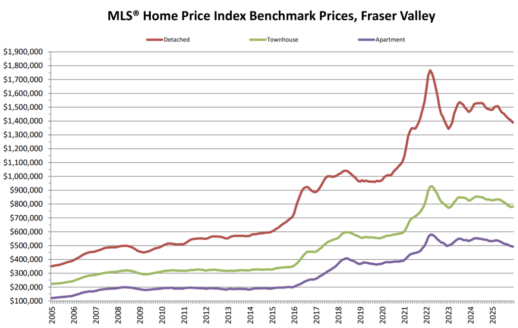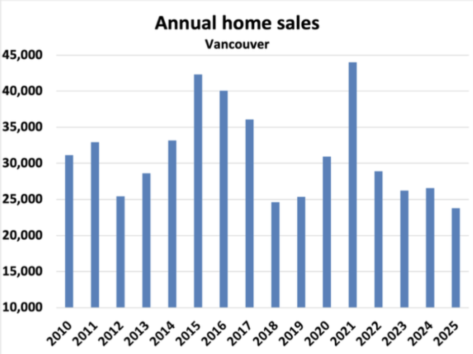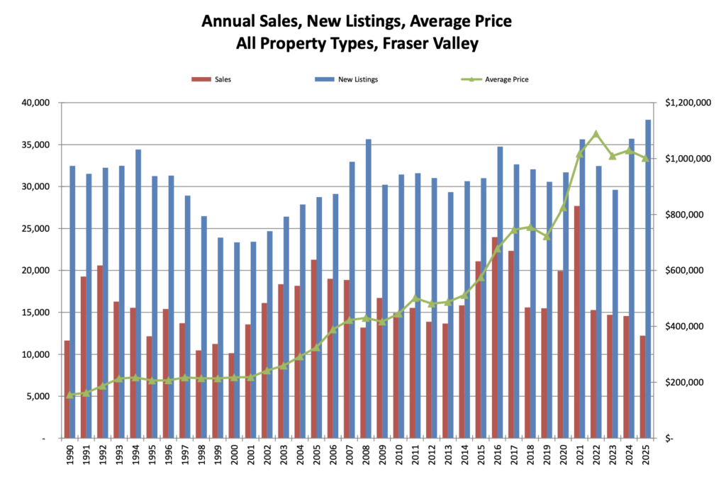 2025 saw 25-year lows for home sales in both the Fraser Valley and Vancouver real estate markets. In the Fraser Valley, sales volumes were down 16% year-over-year, while new listings increased by 6.3%.
