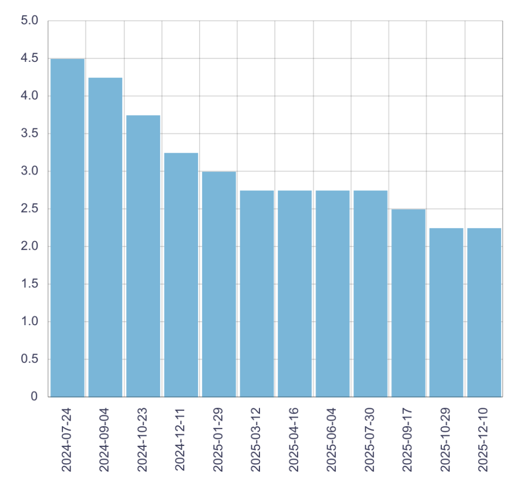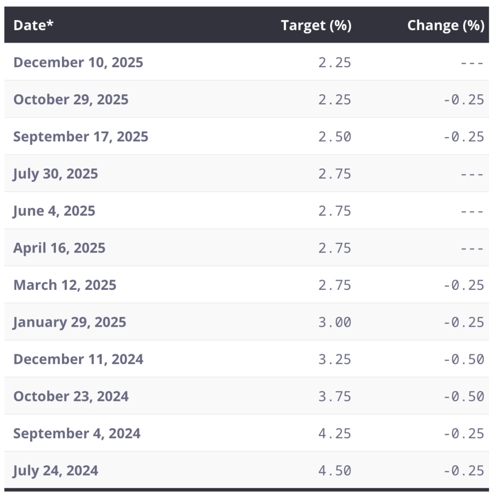 I think we can expect the overnight lending rate to remain stable. The BOC meets eight times/year, and in 2025, they reduced the rate four times, from 3.25% to 2.25% over the course of the year.