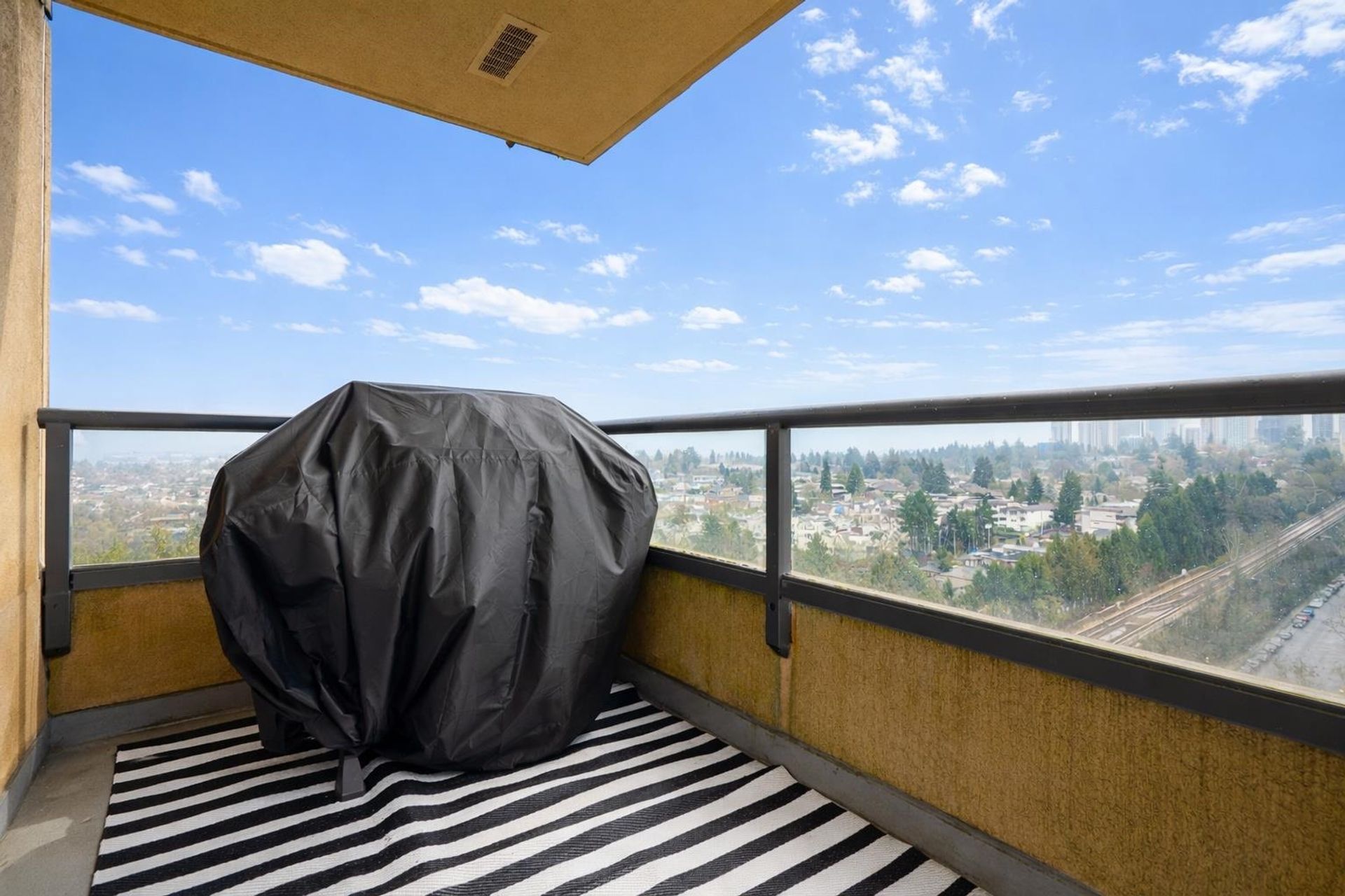 Welcome to Emerald Park Place. This bright and modern 1 bedroom plus den home offers an open-concept layout with updated kitchen cabinetry, newer stove, dishwasher, and microwave, along with upgraded vinyl flooring featuring enhanced soundproofing. The unit is exceptionally quiet and well insulated. The den includes a built-in desk, ideal for working from home, and the living space is complemented by heat-resistant blinds and a built-in A/C mount for year-round comfort. Enjoy stunning, unobstructed 180° city and mountain views that flood the home with natural light. Additional features include in-suite laundry, 1 parking stall, and access to a fully equipped gym. The building has a newer elevator and is located just steps from Joyce SkyTrain, restaurants, parks, and nearby sports courts.