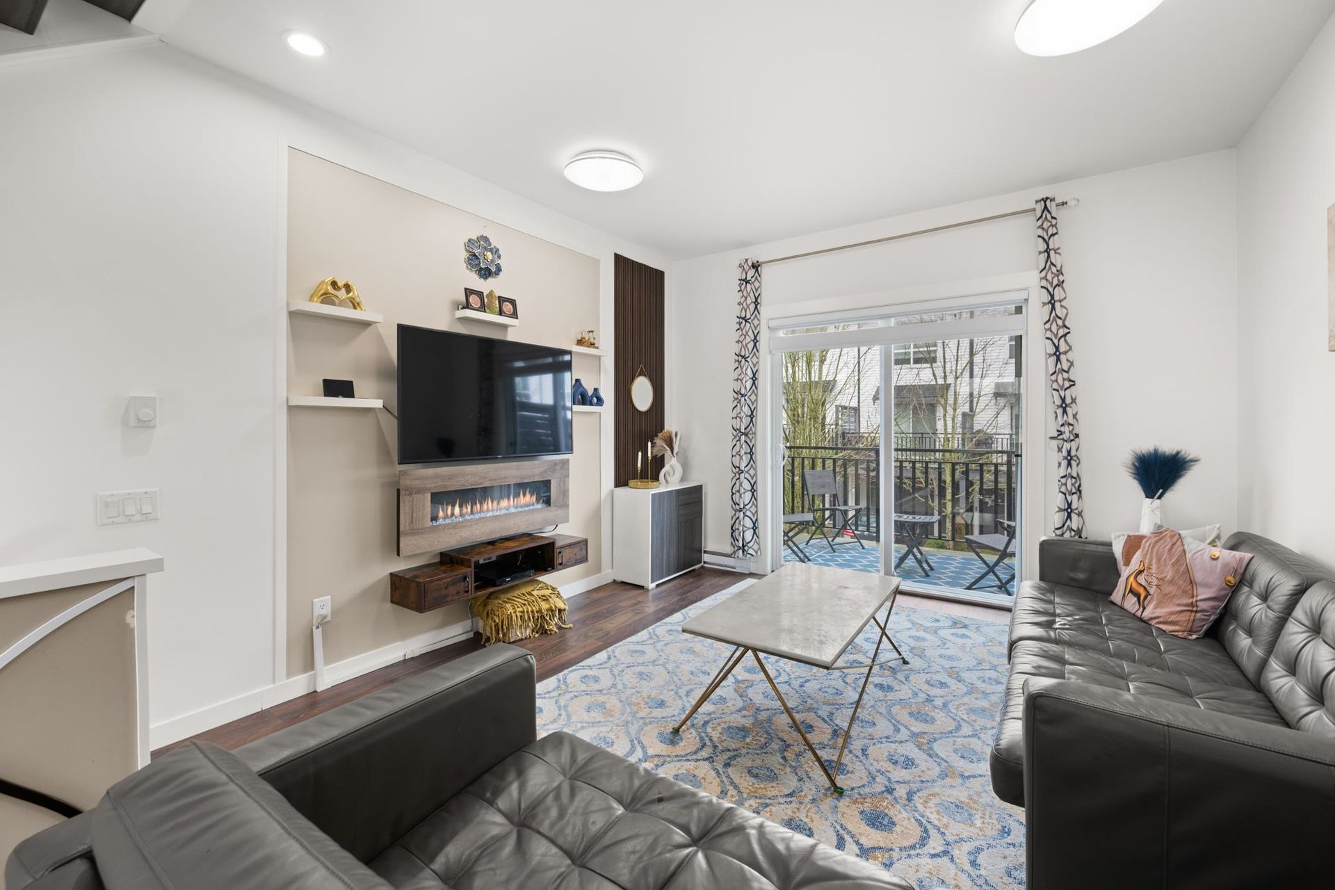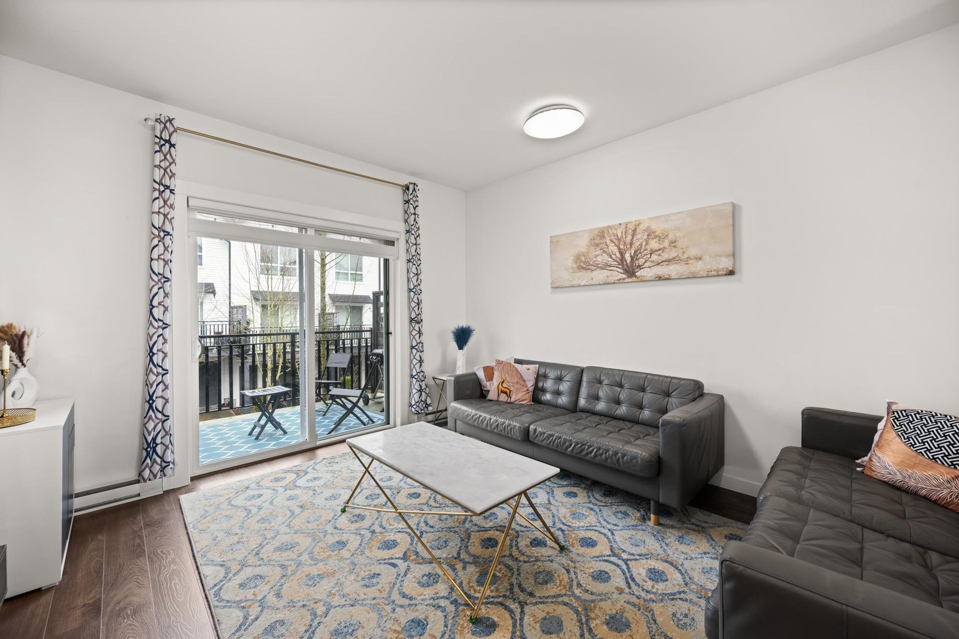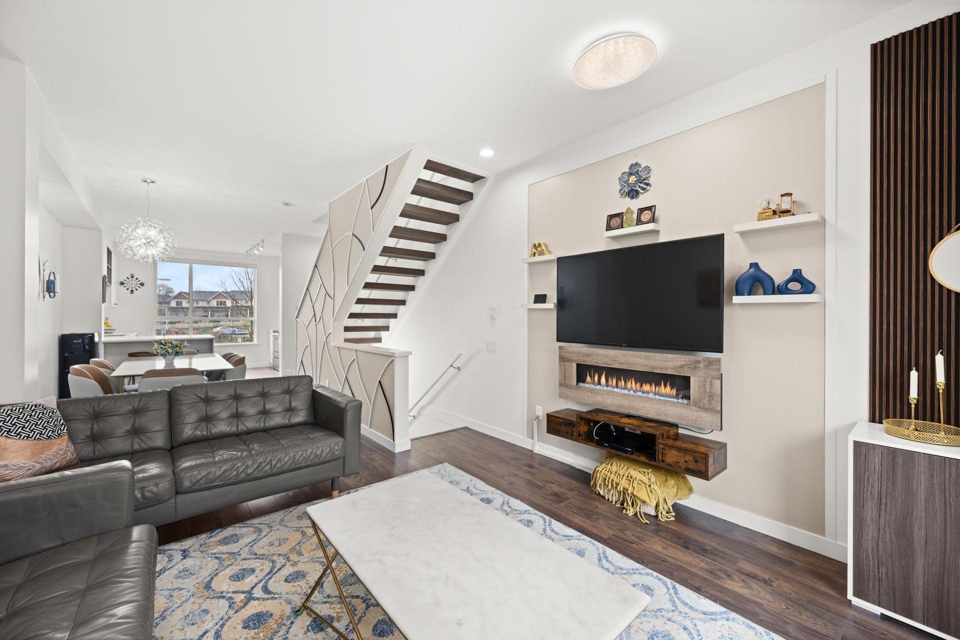 Welcome to this beautifully cared-for, southwest-facing Mosaic home, offering modern design & elegant finishes throughout. This 2-bedroom plus den layout is thoughtfully designed w/open-concept main-floor living, a convenient powder room on the entry level next to den (home office), and two spacious bedrooms with full baths upstairs. Enjoy sunset views from the gourmet kitchen w/ breakfast bar, ample counter space, & room to entertain. Earth-toned wide-plank laminate flooring enhances the bright living area while the stunning open-riser floating staircase makes a statement. Oversized windows flood the home with natural light. Ideally located steps from Clayton Market Retail Village, major amenities, restaurants, Willowbrook Mall, and transit. Parking for 2, garage & driveway.
