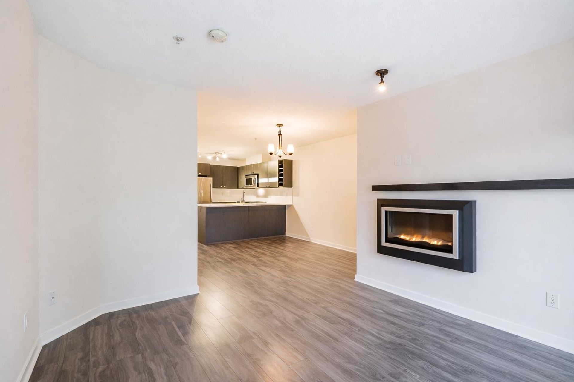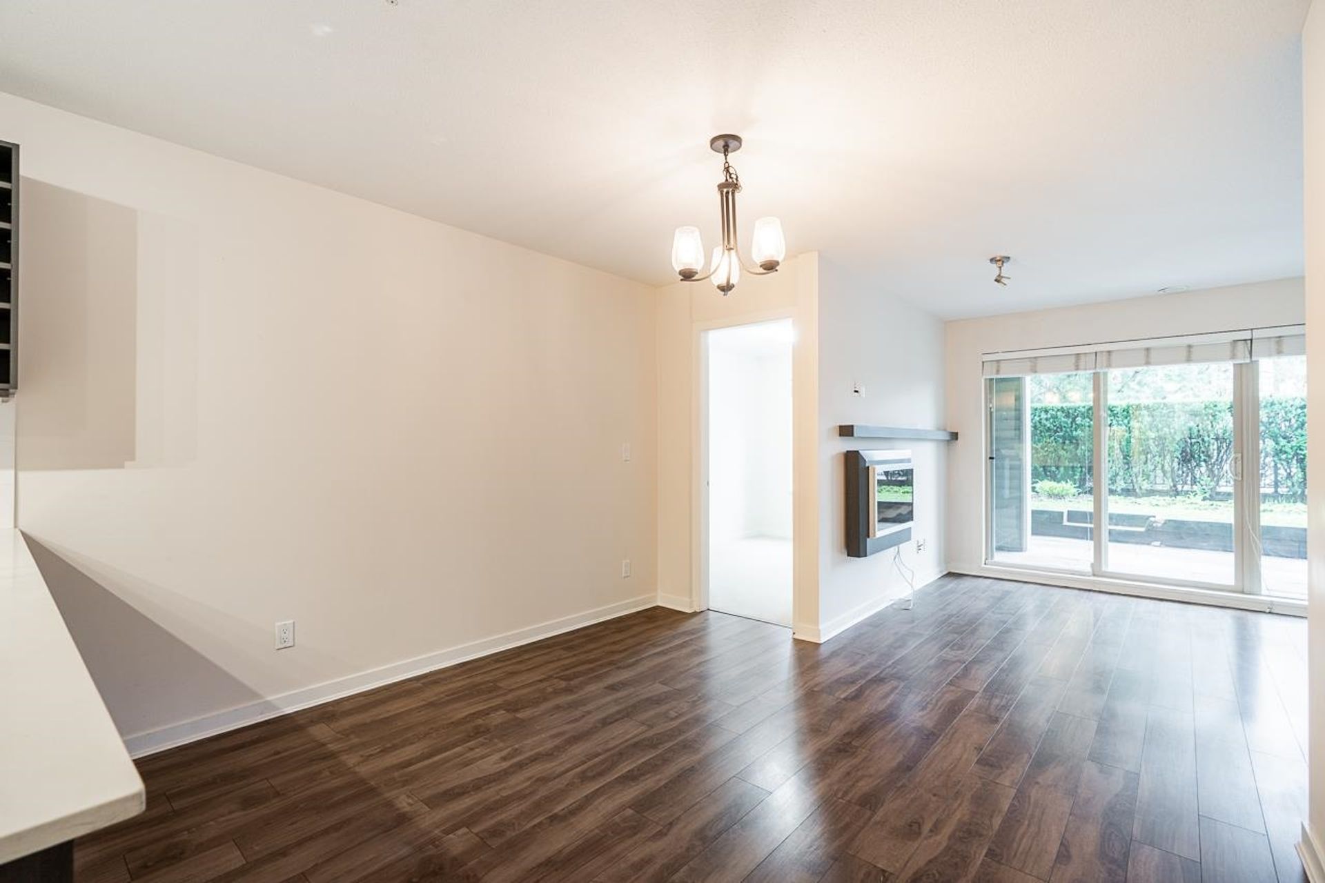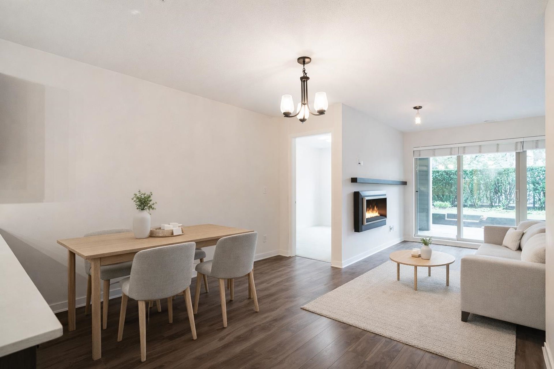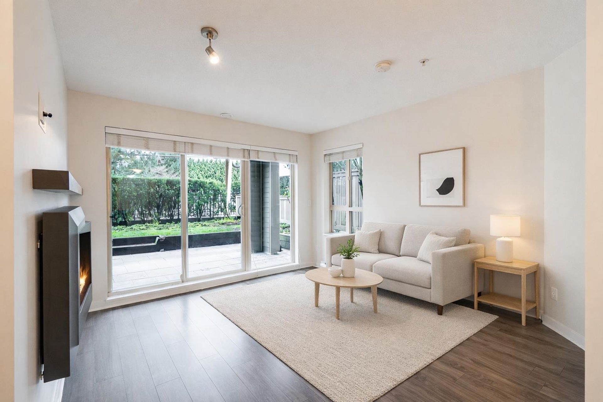 Cornerstone by Marcon — a bright and beautifully designed ground-level home in the heart of Langley. This thoughtfully laid-out residence features a contemporary kitchen with quartz counters, stainless steel appliances, and a breakfast bar flowing into the open living and dining area. A sleek floating fireplace adds warmth and style, while sliding doors lead to your covered patio and fenced yard. Two well-sized bedrooms, including a primary with walk-in closet and cheater ensuite, offer comfortable living. Complete with in-suite laundry, parking, storage locker, and EV charging available. Pet (2, any size!) and rental-friendly building just steps to Safeway, Starbucks, restaurants, parks, Kwantlen Polytechnic, transit, and the future SkyTrain.