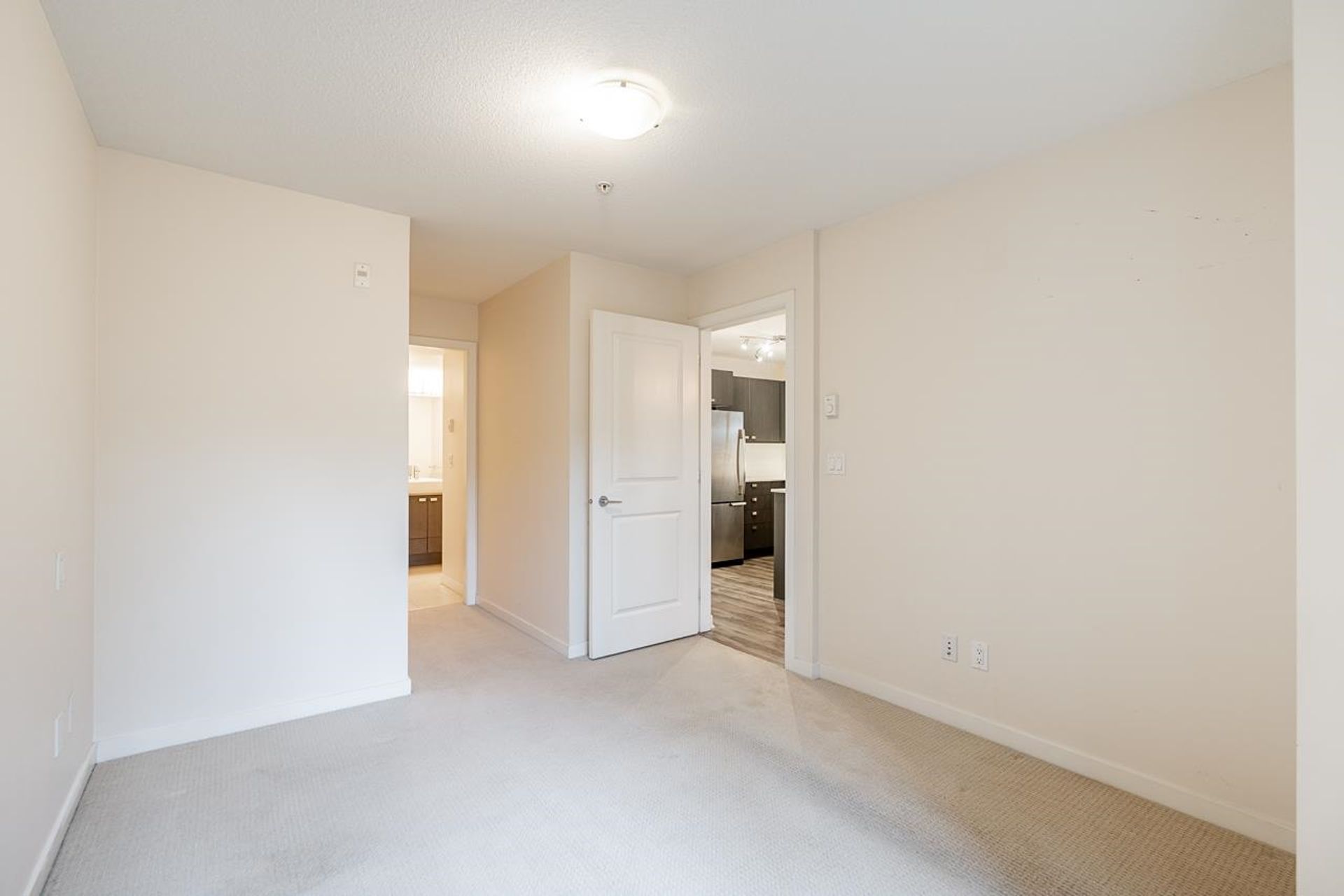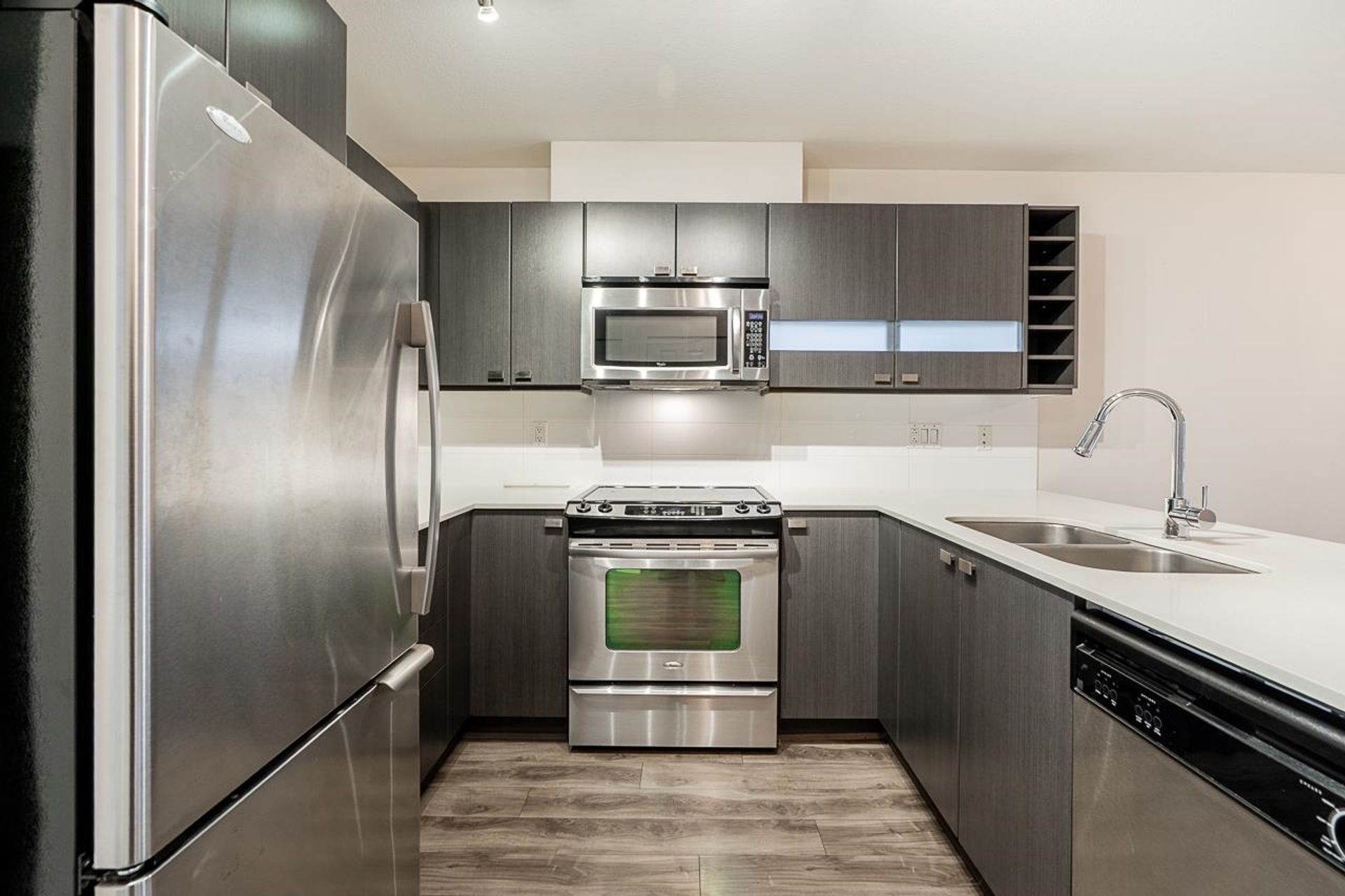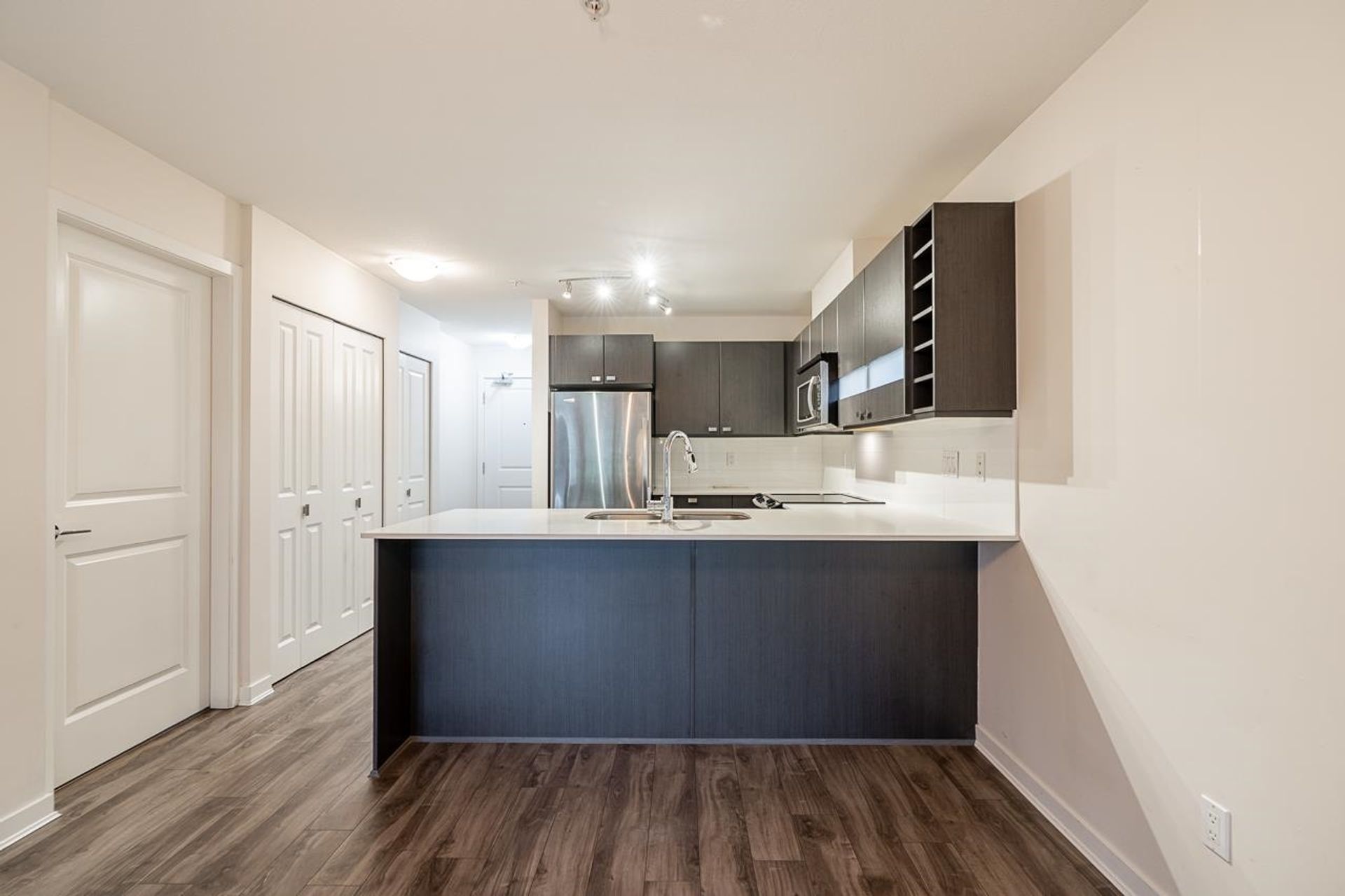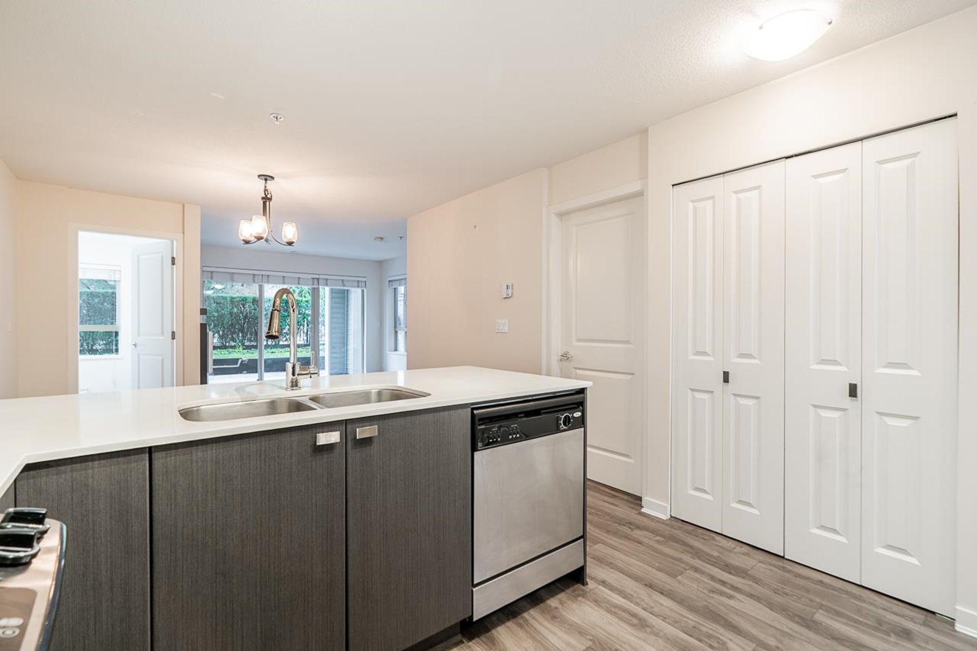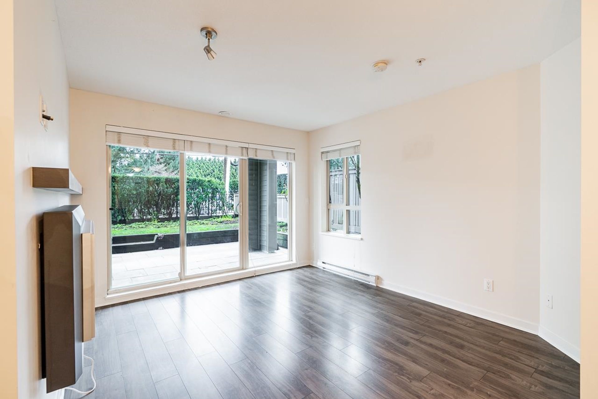 Cornerstone by Marcon — a bright and beautifully designed ground-level home in the heart of Langley. This thoughtfully laid-out residence features a contemporary kitchen with quartz counters, stainless steel appliances, and a breakfast bar flowing into the open living and dining area. A sleek floating fireplace adds warmth and style, while sliding doors lead to your covered patio and fenced yard. Two well-sized bedrooms, including a primary with walk-in closet and cheater ensuite, offer comfortable living. Complete with in-suite laundry, parking, storage locker, and EV charging available. Pet (2, any size!) and rental-friendly building just steps to Safeway, Starbucks, restaurants, parks, Kwantlen Polytechnic, transit, and the future SkyTrain.
