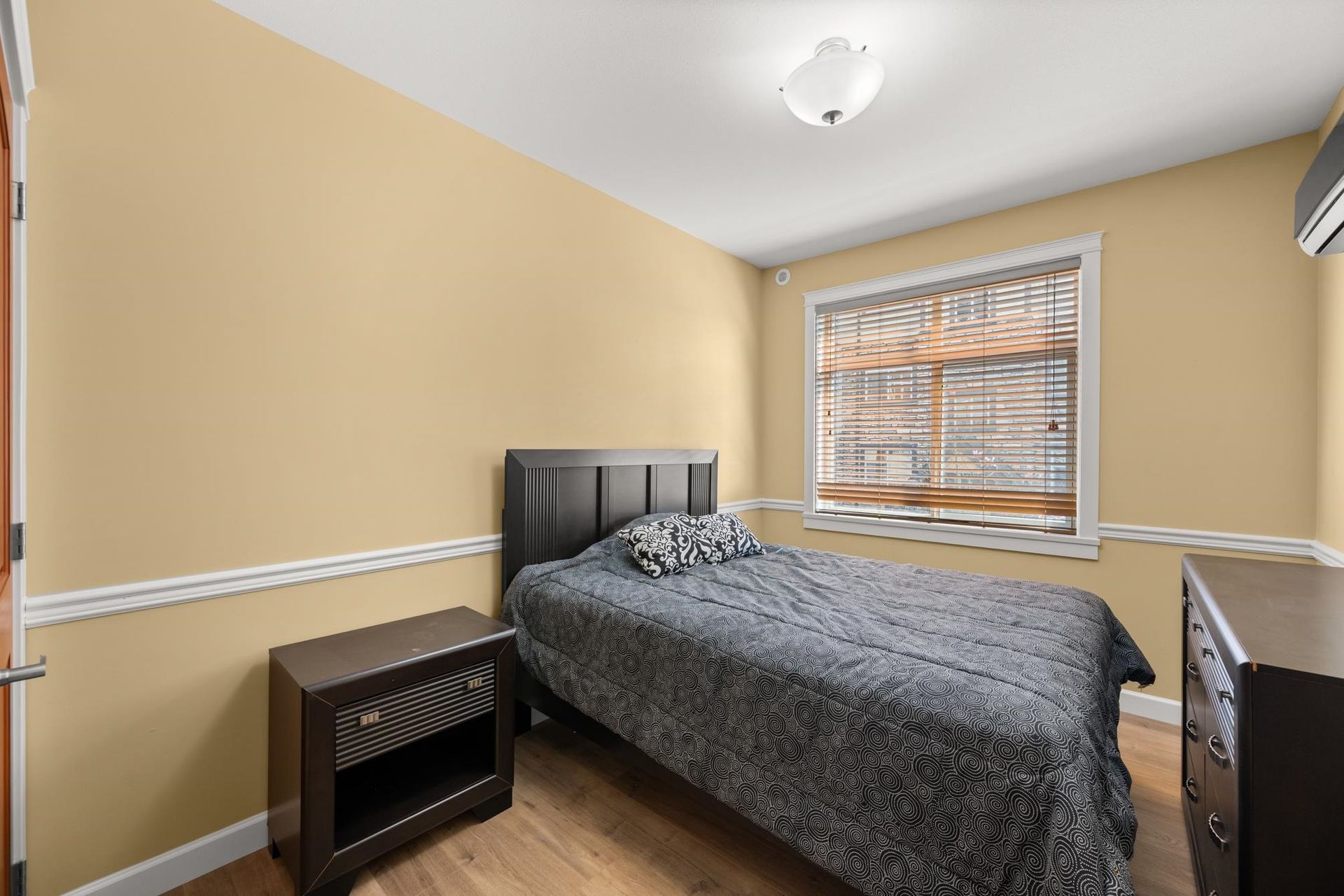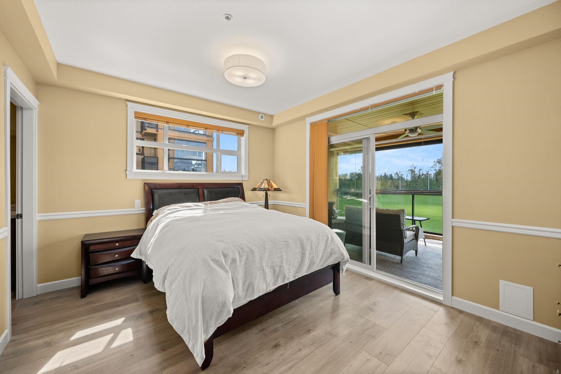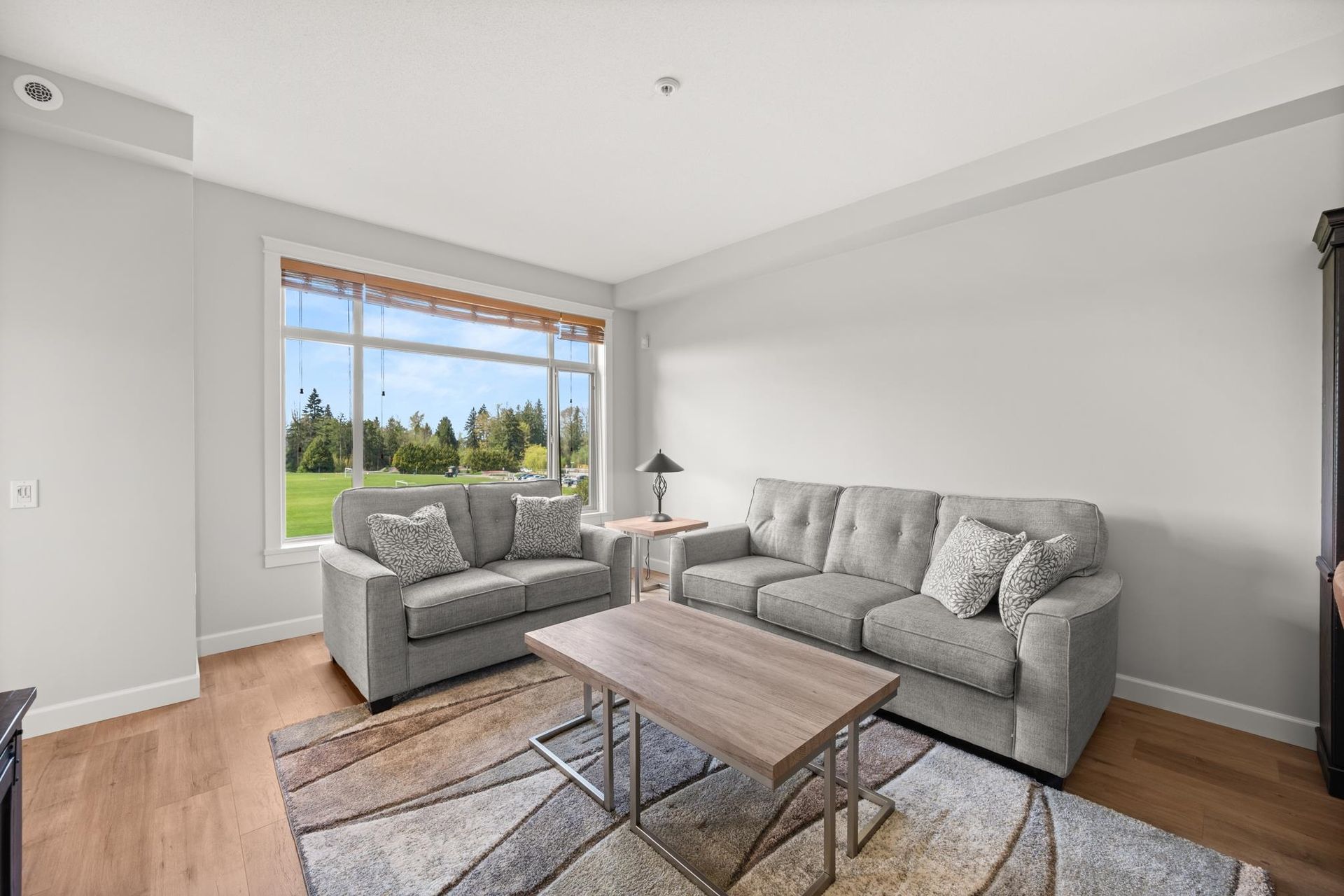 Beautiful 2 bed + den in sought-after Yorkson with stunning park views! This spacious open-concept home offers over 1,000 sq ft featuring dark shaker cabinets, granite counters, stainless steel appliances, gas range, and breakfast bar. The primary bedroom includes a walk-in closet and spa-inspired ensuite with heated floors, double sinks, and walk-in shower. Enjoy year-round use of the enclosed solarium with Lumon retractable glass panels, gas BBQ hookup, and added soundproofing. A/C, heat pump, and gas included in strata. 2 parking with garage-style storage. Pet-friendly building (2 pets ok, max 15KG). Incredible amenities!