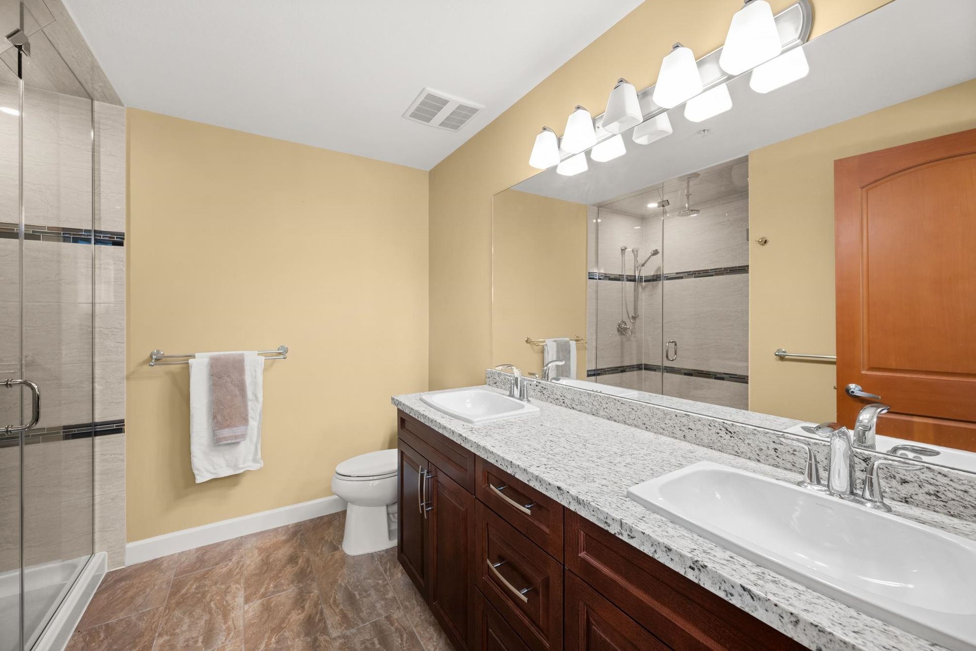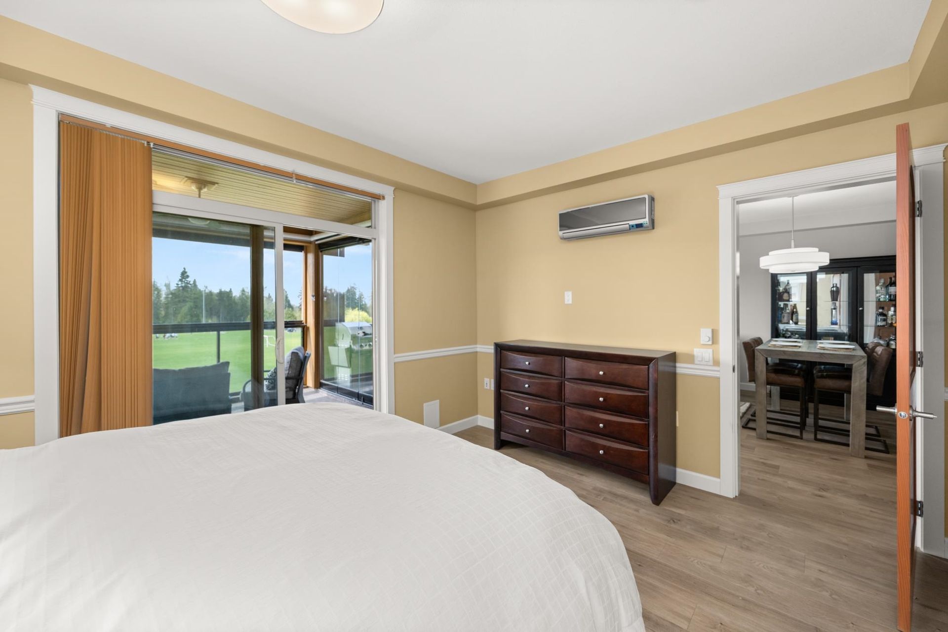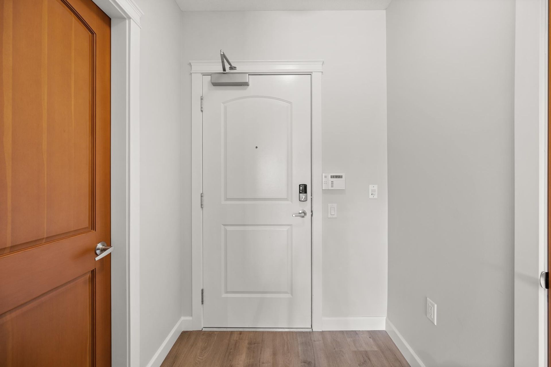 Beautiful 2 bed + den in sought-after Yorkson with stunning park views! This spacious open-concept home offers over 1,000 sq ft featuring dark shaker cabinets, granite counters, stainless steel appliances, gas range, and breakfast bar. The primary bedroom includes a walk-in closet and spa-inspired ensuite with heated floors, double sinks, and walk-in shower. Enjoy year-round use of the enclosed solarium with Lumon retractable glass panels, gas BBQ hookup, and added soundproofing. A/C, heat pump, and gas included in strata. 2 parking with garage-style storage. Pet-friendly building (2 pets ok, max 15KG). Incredible amenities!